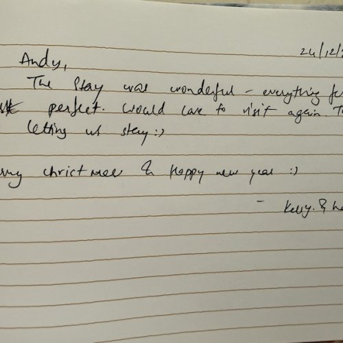 "A beautiful place to celebrate Simons birthday. We felt like we where the first people to ever stay here. Great hosts, very relaxed, beautiful food and views. Thank you."